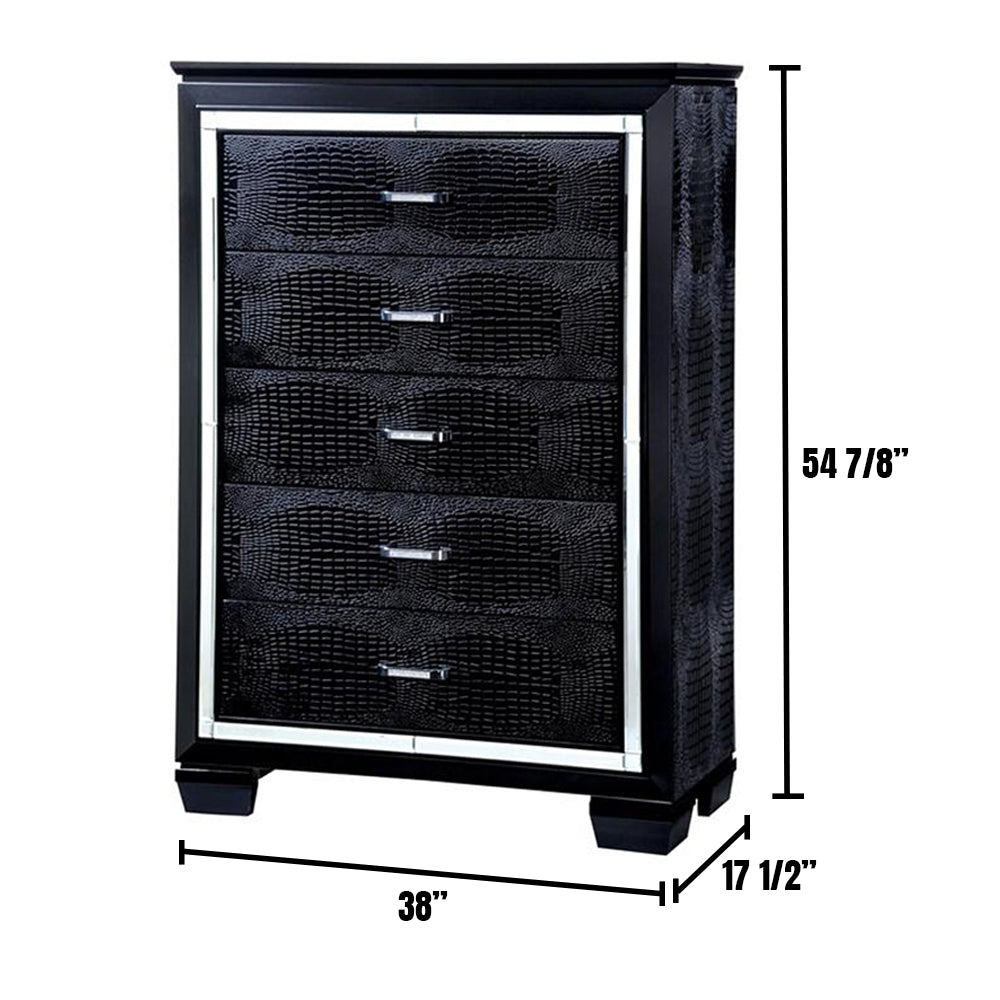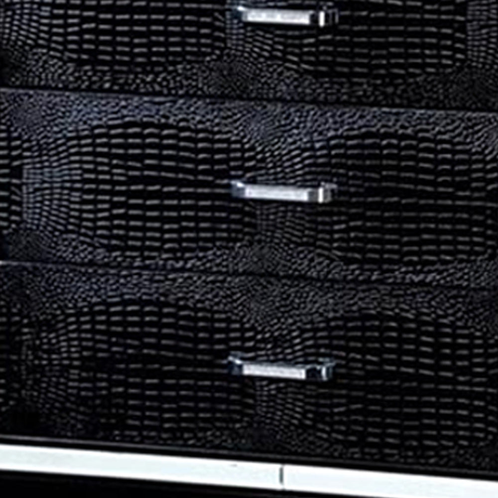 Embrace a touch of glamorous drama in your bedroom with the BELLANOVA Chest in Black Finish. This statement piece features a striking combination of materials and textures, specifically designed to create a luxurious and contemporary feel. The black crocodile-embossed veneer adds a touch of sophistication and a visually interesting pattern, while the contrasting silver lining panels throughout the chest, including the drawers, introduce a touch of modern flair. Solid wood construction ensures long-lasting durability, while felt-lined top drawers provide extra care for delicate items. This chest boasts ample storage space for clothes, blankets, or anything you need to keep organized, making it both a functional and fashionable addition to your bedroom.